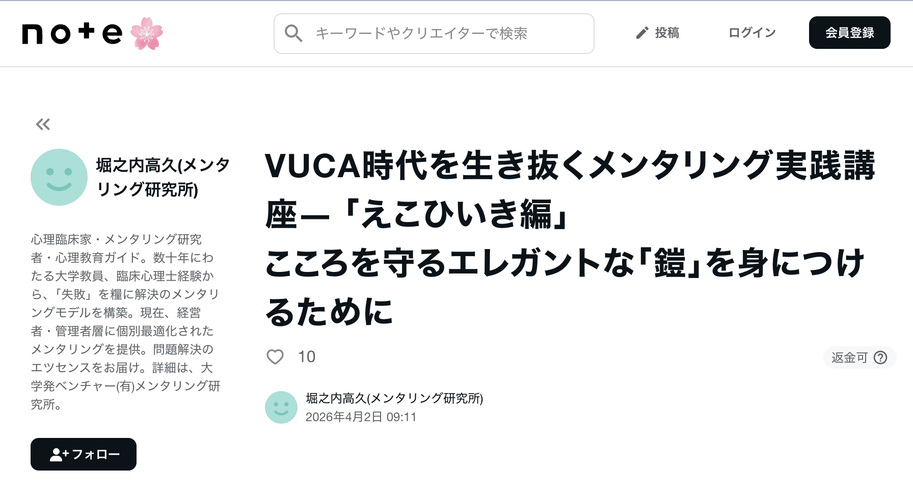 オンライン(note)で、「vuca時代といわれる時代のメンタリング講座」を始めました。今回は、組織のえこひいきを取り上げています。どうぞご覧ください。 https://note.com/horinouchi2026/n/n3904799aa234 〈今後の予定〉 対話と耐話(関係でのコミユニケーションをテーマにしています)退職すること―その解決Beingワークショップの最大の効果を上げるための準備などなど・・ トレーニングのご案内 よろしければシェアをお願いいたします。 URLをコピーしました! Beingワークショップ2026年 夏 関連記事 Beingワークショップ2026年 夏 2026年3月12日 【福祉・介護プロトレーニング2026年3月〜6月】のご案内 2026年1月21日 0.5歩サーバントメンタートレーニング【2026年2月~4月】 2025年7月23日 動画配信を開始しました。 2024年7月11日